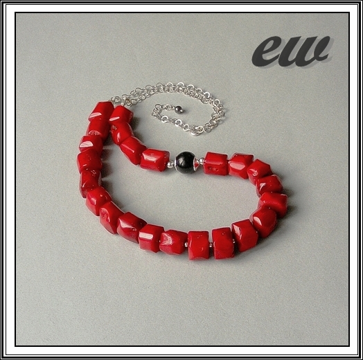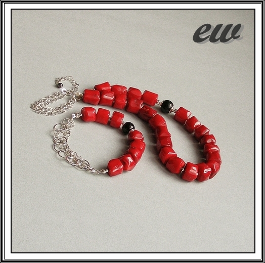 Koral bryłki nieregularne ok. 14 mm/14 mm, w naszyjniku kula onyksu