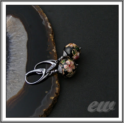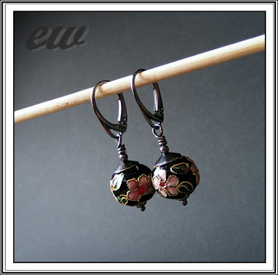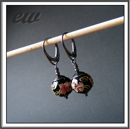 Kolczyki z korali cloisonne 13 mm, srebro oksydowane i polerowane. Długość kolczyków z biglami ok. 4 cm.