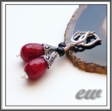 Fasetowane krople jadeitu 20/12 mm i kule onyksu 6 mm, srebro. Długość z biglami 5,5 cm.
