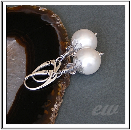 Druga wersja białych pereł swarovskiego (14 mm). Tym razem dodałam rondelle crystal white (6 mm). Elementy srebrne zaoksydowane i mocno przetarte, dzięki czemu zyskały satynowaną powierzchnię, którą bardzo lubię w srebrze. Długość kolczyków 4,5 cm z biglami.