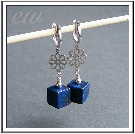 Kolczyki ze srebrnych kwiatków i kostek lapisu z pirytem (10/10 mm). Długość całkowita 5 cm.