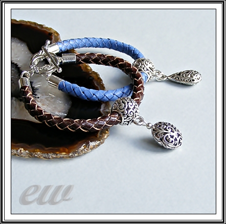Dwie wersje - niebieska i brązowa z metalowymi ażurowymi dodatkami. Gruby (6 mm) pleciony rzemień. Długość ok. 17 cm.