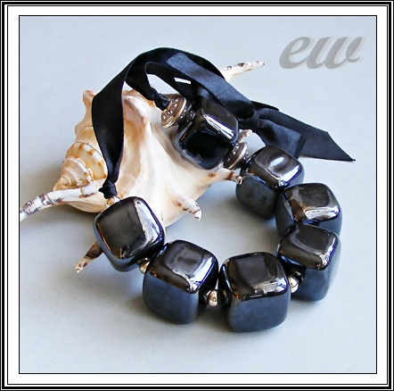 Te olbrzymie (2 cm) kostki z ceramiki przywiozłam z giełdy we Wrocławiu już wiosną, ale dopiero teraz doczekały swojej kolejki :) Zawiesiłam je na satynowej tasiemce, którą należy związać z tyłu. Dla urozmaicenia dodałam tylko metalowe kulki i dwa ozdobne dyski akrylowe (metalizowane). Mimo imponujących rozmiarów naszyjnik jest lekki, bo kostki są w środku puste. Długość do 63 cm.
