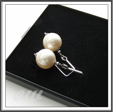 Duże (14 mm) perły swarovskiego w delikatnym kolorze creamrose z oksydowanym srebrem, zawieszone na prostych biglach. Długość całkowita 3,5 cm.
