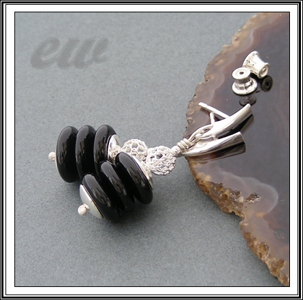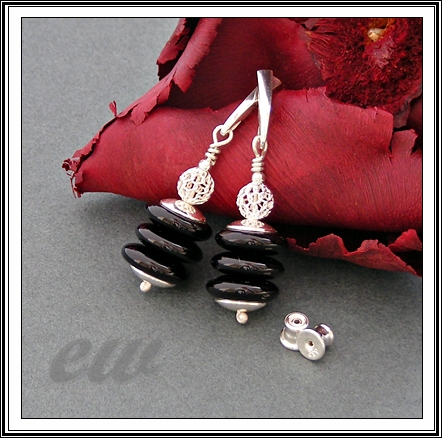 Srebrne kolczyki z pastylek onyksu (10/5 mm), które też swoje odleżały w szafie. Na początku miałam na nie inny pomysł - miała być bransoletka, ale kamyki okazały się na żywo nieco większe niż się spodziewałam, dlatego musiały poczekać na nową koncepcję :) Długość ze sztyftami 4 cm.