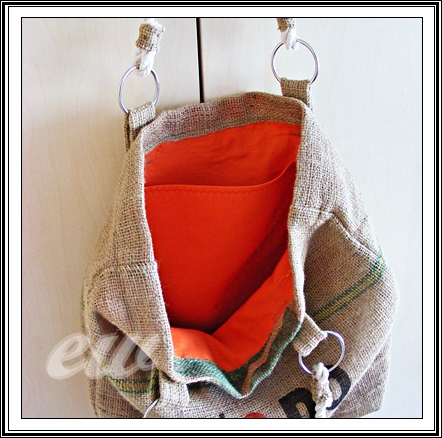 Wyszła olbrzymka w sam raz na zakupy. Brakuje jej zapięcia, bo mam zamiar traktować ją jak koszyk na zakupy w pobliskim markecie na "B" ;) W środku jest tylko olbrzymia kieszeń, która dostanie niedługo kawałek rzepa jeśli znajdę inny niż czarny :( Miałam problem z dopasowaniem podszewki i znów padło na pomarańczowe płótno. Podkleiłam je camelą, żeby torba choć trochę trzymała kształt. Przy okazji okazało się, że camela ma kolor zbliżony do worka i nie prześwituje "obca barwa", co mnie bardzo ucieszyło. Do wymiany pójdą też sznury, które jakoś mi nie pasują. Planuję dać skórzane paski pod warunkiem oczywiście, że jakieś pasujące trafię w SH za rozsądną cenę ;)