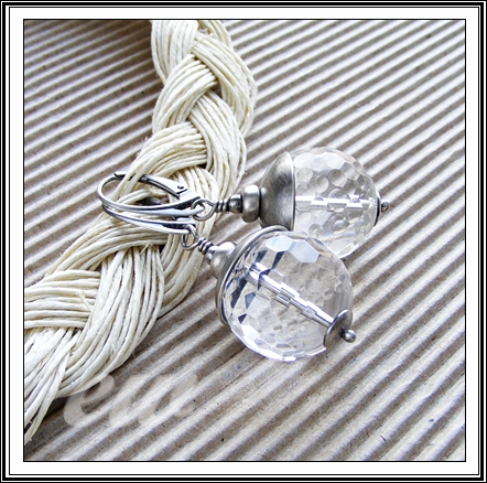 Olbrzymie (mają ok. 2 cm średnicy) kule fasetowanego kryształu górskiego. Kupiłam właściwie bez zastanowienia, a gdy do mnie dotarły, pojawił się problem, co do nich dodać. Niewiele mam tak dużych elementów srebrnych i musiałam znowu wybrać się na zakupy. Szczęście mi dopisało, więc mogę dzisiaj pokazać kolczyki. Srebro zaoksydowałam, przetarłam i pozostawiłam niewypolerowane - dla kontrastu. Mimo, że kolczyki są tak duże wcale nie wydają się ciężkie, chociaż nie polecałabym ich do pracy ;)